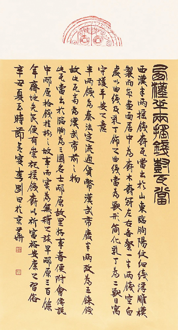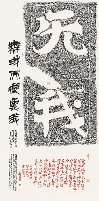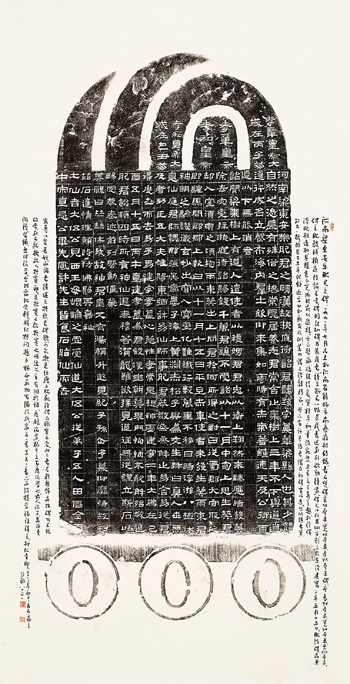 中国书协理事、西泠印社理事高庆春认为,一件好的题跋不仅要有相关背景、金石文化、器物细节的记载、描述,同时还要兼顾作品画面的整体虚实摆布、平衡关系,及书法字体的变换和视觉美感,包括印章在内的整体布阵。以沉静内敛的篆隶楷及行书表现在题跋作品上,不失为一种不错的选择。河南省书协副主席、中国国家画院书法篆刻专业委员会研究员周斌在创作中反复考虑后,选用河南出土的《肥致碑》作为题跋拓本,“《肥致碑》既不失隶书字体规范,又有独到之处的面貌,具有较高的书法艺术价值。整体布局上具有规整划一、井然有序之特点。在单字结构组合上则表现出相当大的、有目的的随意性,并有别出新意之处,显现出既活灵活现又古拙稚朴、既不失隶书字体规范又有独到之处的面貌,具有较高的书法艺术价值”。在创作中,他注重形式的变化和整体把控,篆隶书体与金石拓片相得益彰,既为厚重的历史文化增添了新的文化内涵,又能给欣赏者带去多重审美享受。